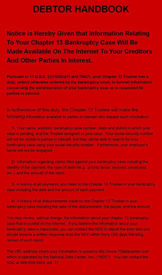 Welcome to the Chapter 13 Trustee Online Debtors Handbook This online copy of our Debtors Handbook is designed to assist you during your Chapter 13. Within this online book you will find the following information on the stated page. · Your Payment to the Trustee · Court’s Jurisdiction of Wage Order · Contact By Creditors Page Two · Balance Due Creditors · Claims of Creditors · Creditors Not Listed Page Three · How Creditors are Paid · Cosigners and Co-Makers · Credit Cards and Charge Accounts · Permission for Credit · Obtaining Credit without Permission Page Four · Selling Property · Real Estate Debts · Checks Held by Others · Problems with Employers because of Chapter 13 · Discharge Page Five · Request for Dismissal · Income Tax Refund · Lawsuit Settlement and Other Lump Sum Payment · Contact by Creditor After Chapter 13 |