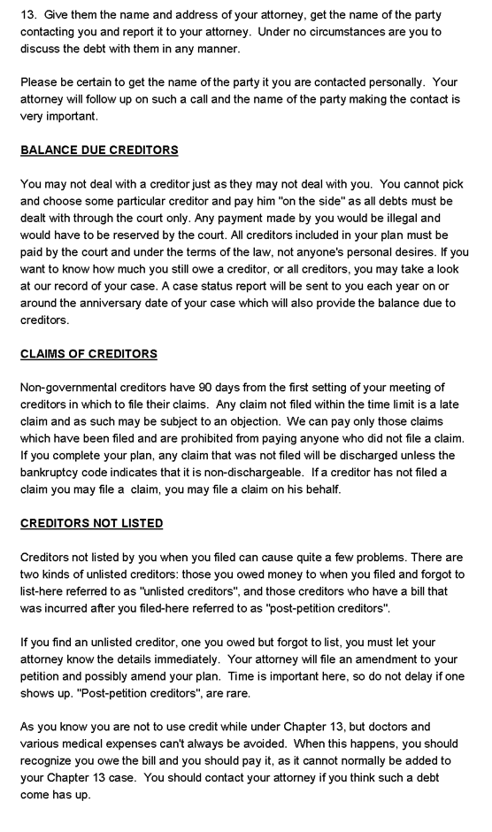 Welcome to the Chapter 13 Trustee Online Debtors Handbook This online copy of our Debtors Handbook is designed to assist you during your Chapter 13. Within this online book you will find the following information on the stated page. · Your Payment to the Trustee · Court’s Jurisdiction of Wage Order · Contact By Creditors >> Page Two · Balance Due Creditors · Claims of Creditors · Creditors Not Listed Page Three · How Creditors are Paid · Cosigners and Co-Makers · Credit Cards and Charge Accounts · Permission for Credit · Obtaining Credit without Permission Page Four · Selling Property · Real Estate Debts · Checks Held by Others · Problems with Employers because of Chapter 13 · Discharge Page Five · Request for Dismissal · Income Tax Refund · Lawsuit Settlement and Other Lump Sum Payment · Contact by Creditor After Chapter 13 |