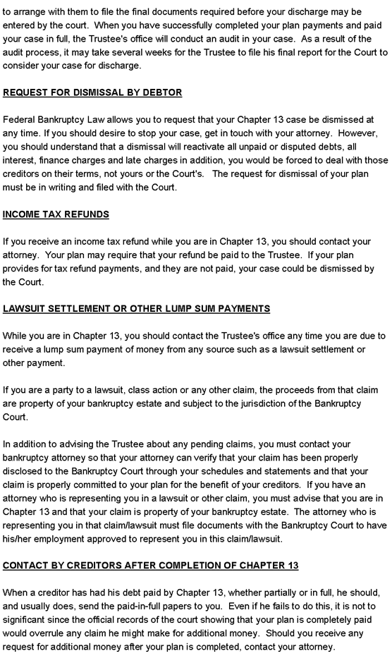 Welcome to the Chapter 13 Trustee Online Debtors Handbook This online copy of our Debtors Handbook is designed to assist you during your Chapter 13. Within this online book you will find the following information on the stated page. · Your Payment to the Trustee · Court’s Jurisdiction of Wage Order · Contact By Creditors Page Two · Balance Due Creditors · Claims of Creditors · Creditors Not Listed Page Three · How Creditors are Paid · Cosigners and Co-Makers · Credit Cards and Charge Accounts · Permission for Credit · Obtaining Credit without Permission Page Four · Selling Property · Real Estate Debts · Checks Held by Others · Problems with Employers because of Chapter 13 · Discharge >> Page Five · Request for Dismissal · Income Tax Refund · Lawsuit Settlement and Other Lump Sum Payment · Contact by Creditor After Chapter 13 |